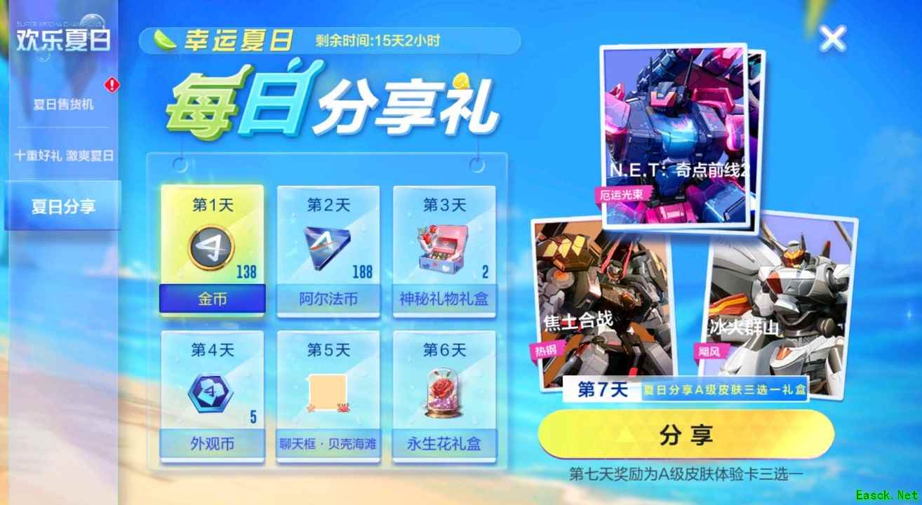 福利再升级,从7月8日-7月21日,玩家累计7天分享游戏内容还可免费领取“A级机甲3天体验卡”等福利,多款精美机甲皮肤等你来体验。