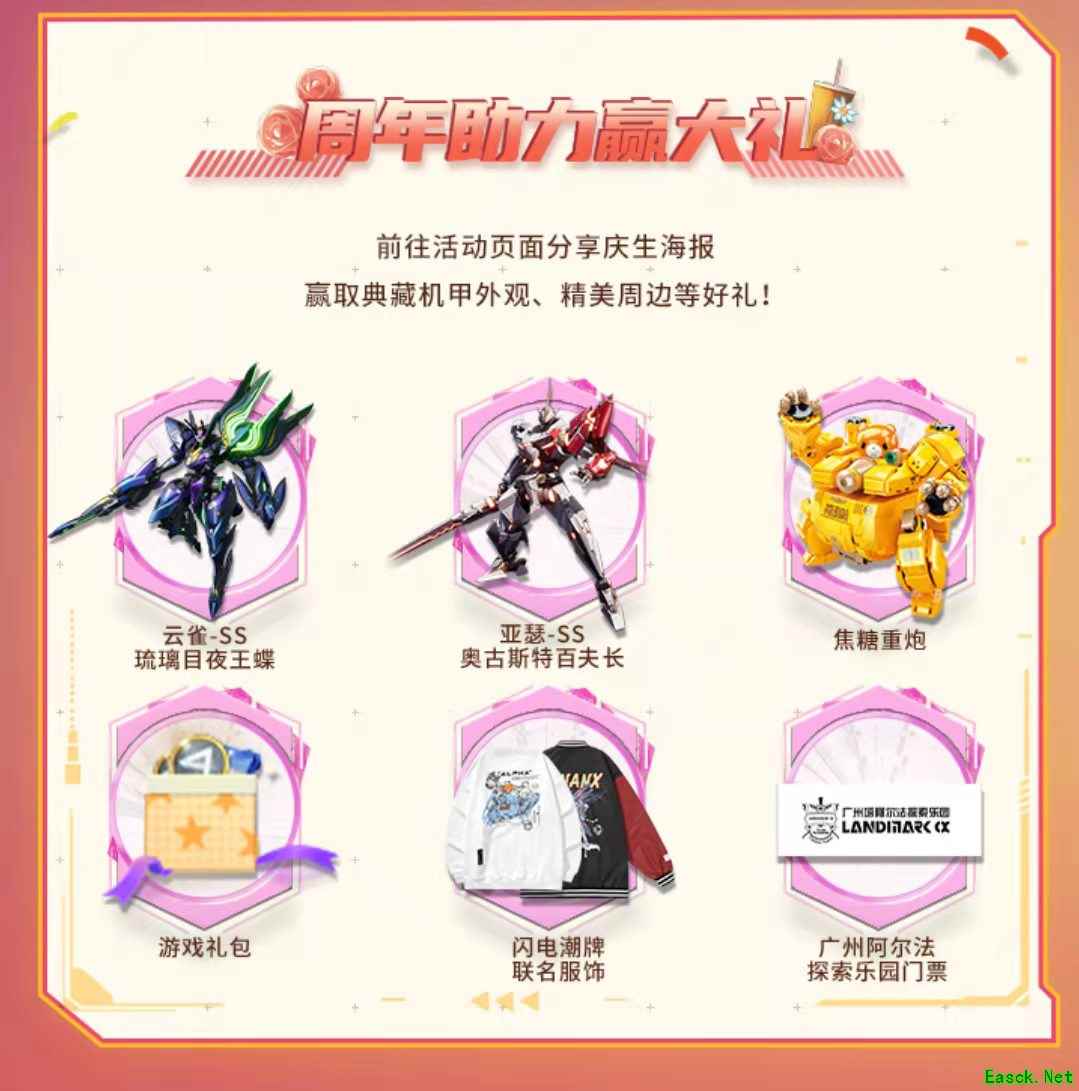 各位驾驶员们可前往活动页面分享庆生海报,即可赢取包括典藏机甲外观、精美周边在内的好礼;参与纪念计划,在胜者为王模式中解密加密信件,还可领取榴弹发射器皮肤“周年庆-年年有余”,以信传心,欢欢喜喜过个开心年。此外,完成周年庆连连看和每周任务,还有纪念头像、典藏礼券、20000金币等丰厚奖励等你来拿。