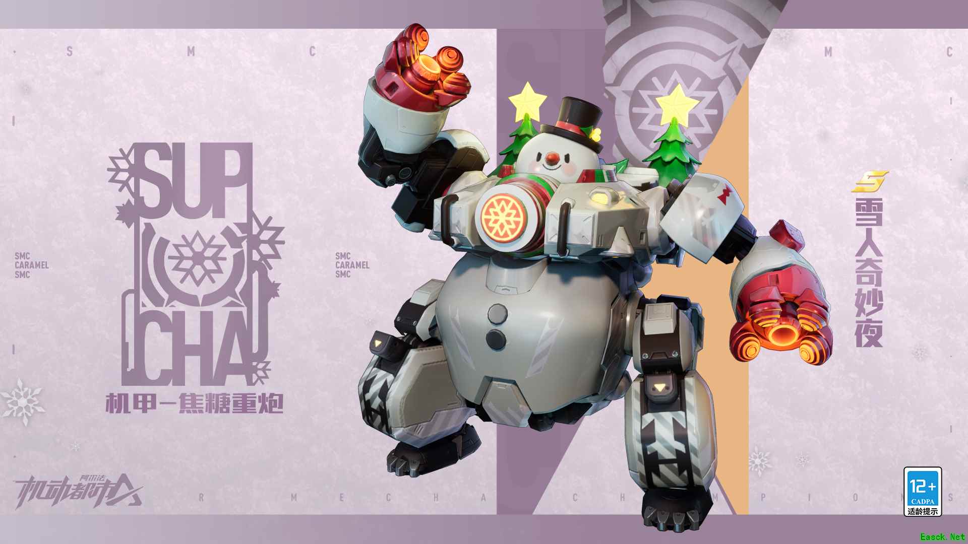 机甲焦糖重炮则变身圆滚滚的雪人,加上圣诞树和围巾的保暖搭配,滑稽又可爱。厄运光束也被装扮成了霸气麋鹿,戴着红色的圣诞帽,温柔地在口袋里装满给孩童的礼物,极具反差萌。