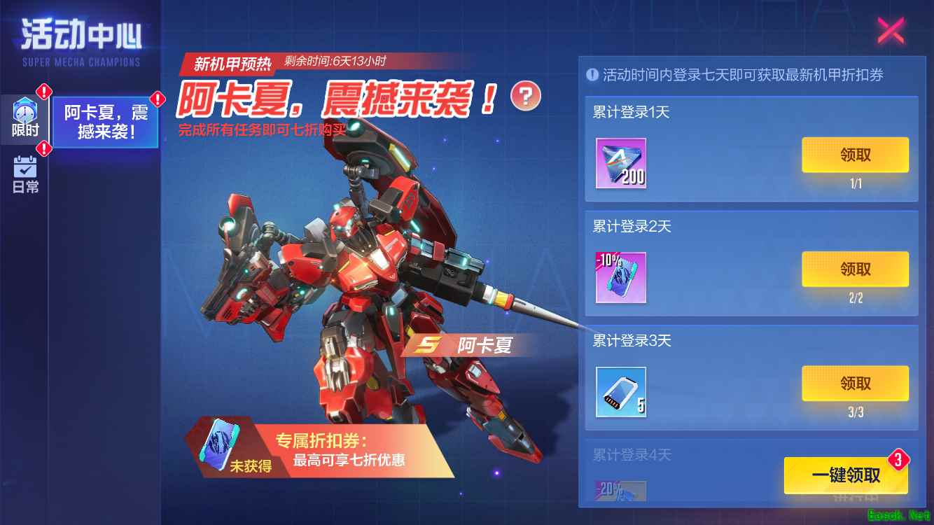 新机甲即将上线,累计登录领好礼,最高可获得阿卡夏七折购买折扣券!