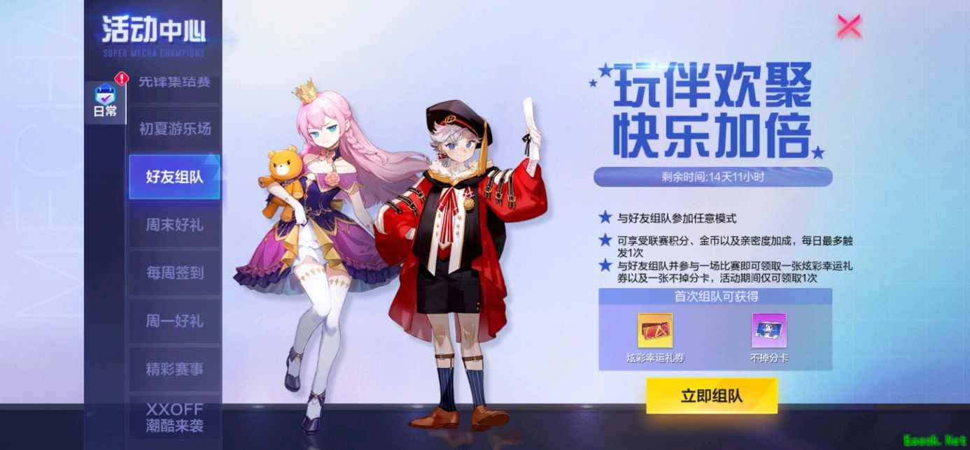玩伴欢聚,快乐加倍!与好友组队享受金币及亲密度加成,更有不掉分卡及炫彩幸运礼券等你来拿!