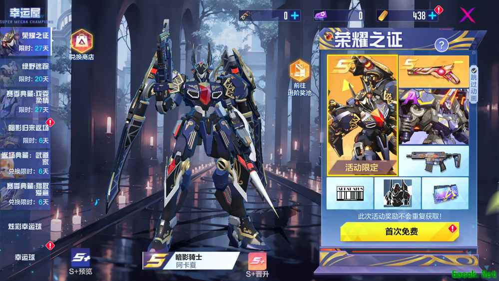 阿卡夏S级外观 “暗影骑士”,热钢A级外观“荣耀铁卫”,激光镭射枪S级外观“天使之翼”上线该奖池