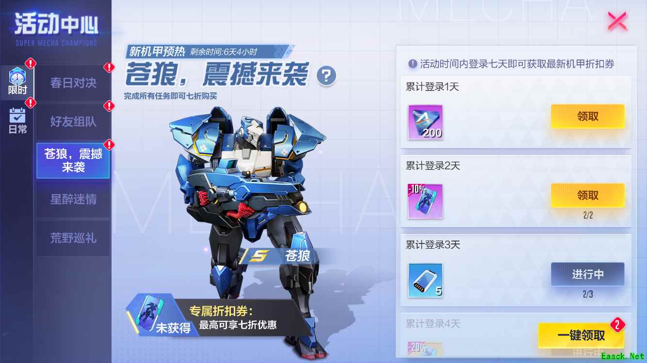 新机甲即将上线!4月20日至4月26日,累计登录最高可获得苍狼七折购买折扣券!