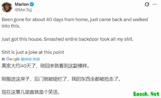 Marlon在社交平台发布动态坦言:“这是我人生中最漫长的一个月,结果回到家就看到房子被砸、被偷。我才搬进来几个月,一直都不在家,却有人闯进去砸穿了我的后门和窗户,衣服扔得满地都是。”他补充说:“我刚下飞机就接到这个消息。我的PS5被偷了,好多东西都不见了,整个屋子一片混乱。”