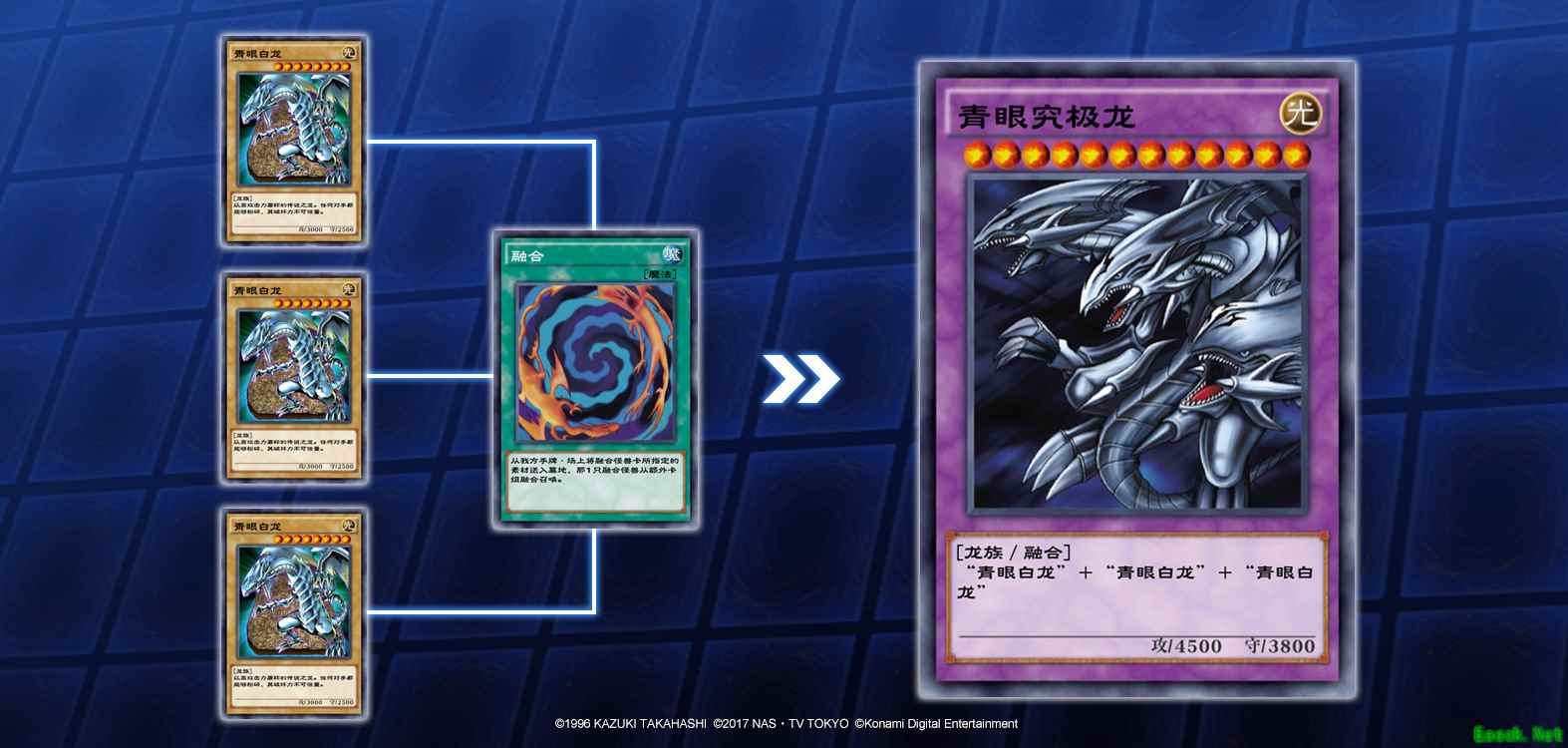 以融合怪兽“青眼究极龙”为例,它所需的融合素材为3只“青眼白龙”。当自己场上和手牌集齐3只“青眼白龙”时,发动“融合”魔法卡,将集齐的3只“青眼白龙”送去墓地,即可将“青眼究极龙”从额外卡组特殊召唤到场上。