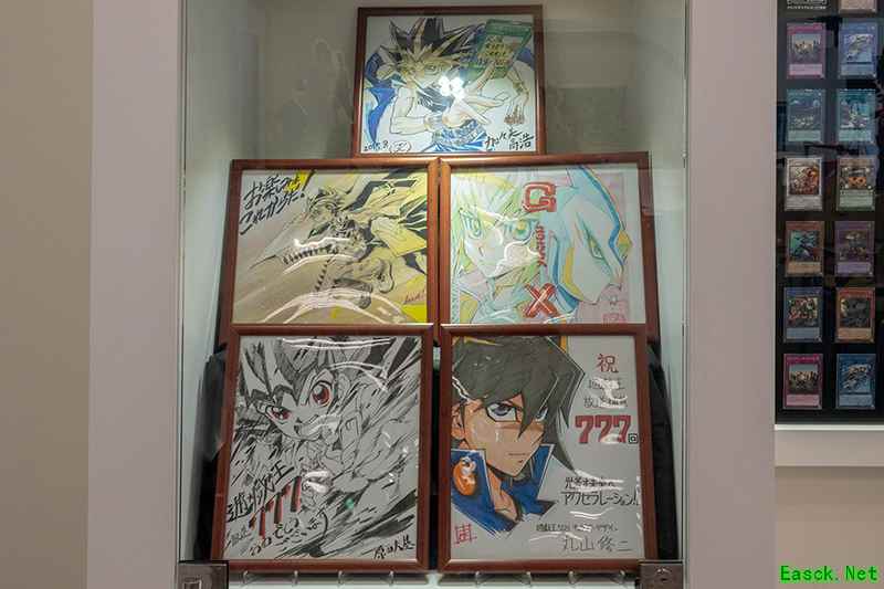 卡牌墙边上是一个特别的橱窗,里面展示了《游戏王》历代动画画师的签名色纸,对于动漫粉丝而言,具备非常大的吸引力!