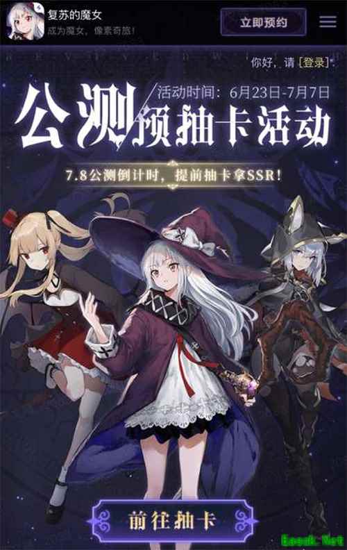 预抽卡活动时间为6月23日至7月7日23:59,现已正式开启,所有已经预约《复苏的魔女》的玩家均可登录参与,手机号登录参与即可。