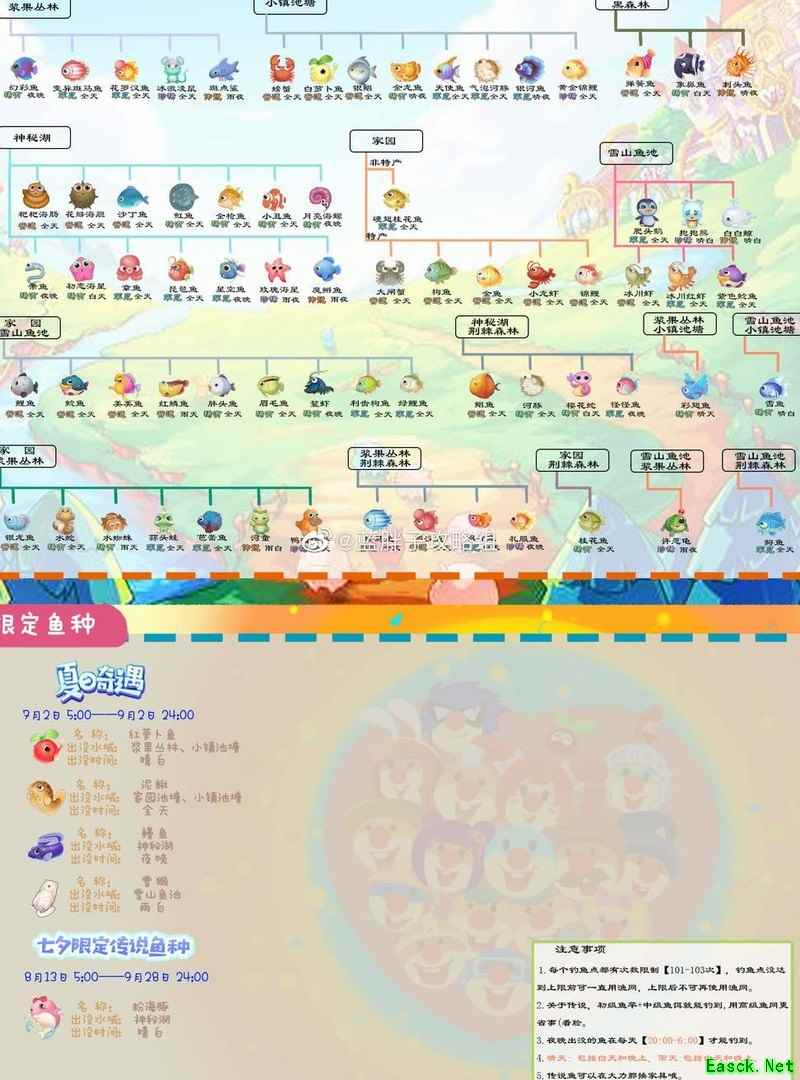 许愿龟在雪山鱼池全天可钓,浆果丛林仅雨夜能钓到。