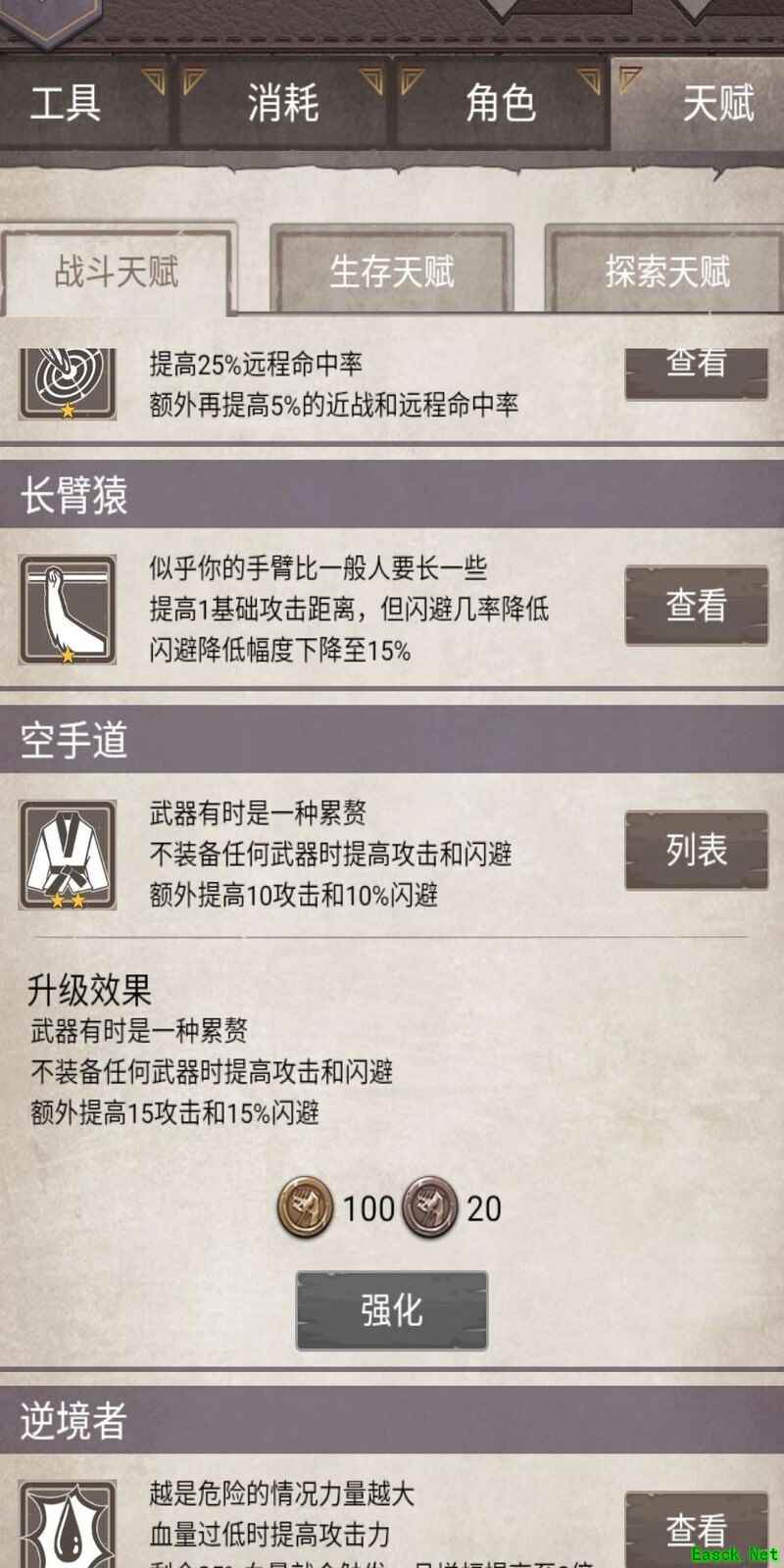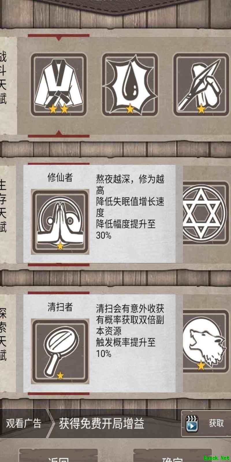 开局首选空手道清扫者与修仙天赋,前者提升战斗效率,后者应对高挑失眠问题。附加属性优先选3%闪避,类似低配版蝴蝶鱼效果。空手道升至二星,其余天赋均点一星即可成型。