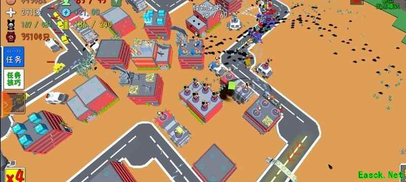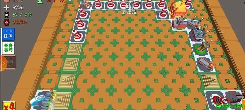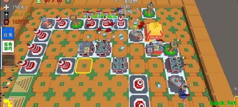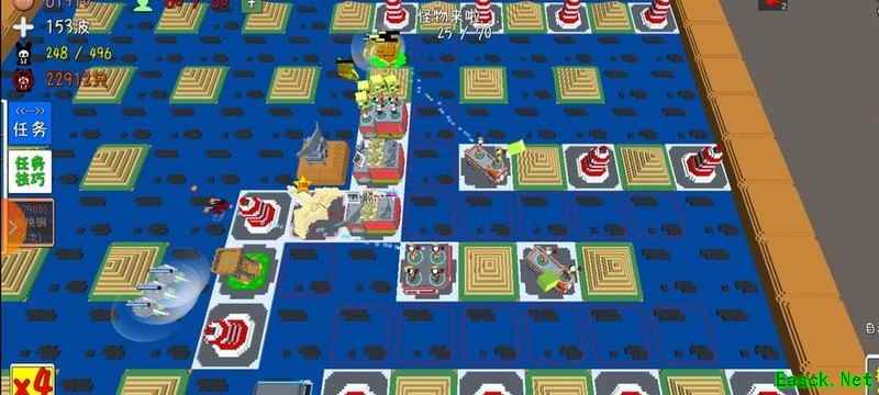 20波普通难度,全为水系怪物,采用双喷双资开局,配合两个坑位放置喷射塔与科技塔。遇路障时引导怪物从上方通行,便于喷射塔集中控怪。待资金约150时,部署六格范围防御(含四轮与两名拳击手),覆盖全场。