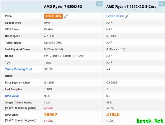 数据显示,9850X3D的PassMark分数为41840,相较于9800X3D的平均分39962,整体性能提升约4.7%。