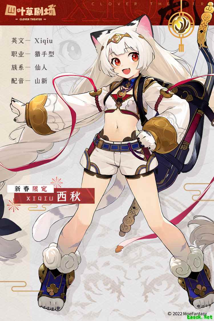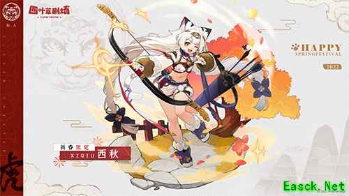 白虎作为中国古代神话中天之四灵之一,又逢壬寅年,新春限定SSR演员——西秋即将登场!神兽白虎为西方战神,五行主金,象征四季中的“秋”,所以我们将这位角色命名为“西秋”,并让她出生于东方大陆,添加了在白虎堂学习、修炼,并成为了仙人的过去,更多关于她的故事等你解锁!