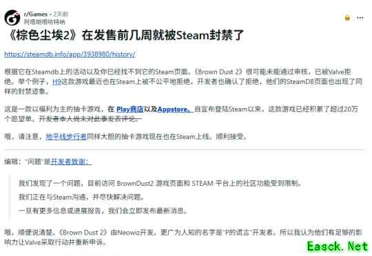 游戏发行方Neowiz已就此发表官方说明,确认Steam对游戏页面及社区功能进行了限制:“我们发现了一个问题,导致目前《棕色尘埃2》的 Steam 商店页面及社区功能受到限制。我们已与 Steam 保持沟通,并正努力尽快解决问题。一旦有最新进展,我们将及时告知。感谢大家的理解。”