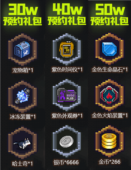 截至日前,《像素危城》全平台百万预约已达成,所有预约奖励也全数发放。其中包括,达成30万预约所发放的宠物箱、冰冻装置和哈士奇,达成40万预约所开放的紫色品质时间仪、紫色外观券和6666硬币,还有达成50万预约最终解锁的金色品质晶石、金色品质火焰装置和266金币。