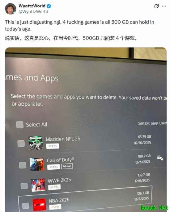 12月7日,内容创作玩家@WyattzWorId在个人推特上发文吐槽了如今游戏占比太大的情况:“说实话,这真是恶心。在当今时代,500GB只能装4个游戏。”