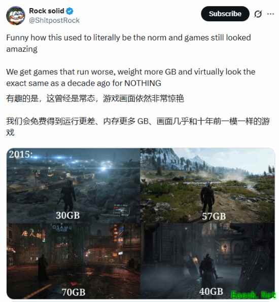 而这一内容也被另一玩家@ShitpostRock援引,他放出了游戏画面对比,并感叹“我们会得到运行更差、内存更多GB、画面几乎和十年前一模一样的游戏。”