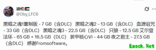 而FromSoftware的粉丝玩家@Oby_LFC6转发该帖表示,还好他关注的几款游戏大小相对比较合理,并顺带整理出了多款游戏的文件大小。看到这些数据,再跟@WyattzWorId吐槽的这些100GB的游戏作品相比,显然更精巧。