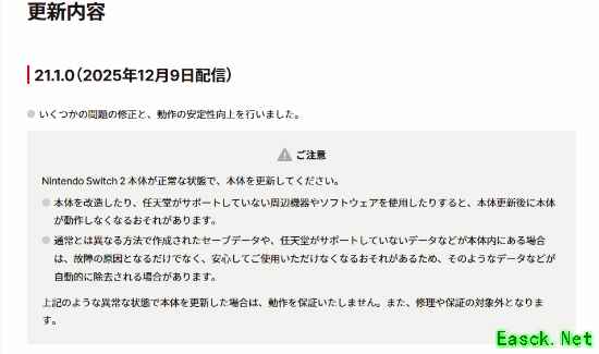 今日,任天堂开始为Nintendo Switch 2推送最新系统版本Ver. 21.1.0。本次更新说明依旧言简意赅,官方日志仅表示“修复了若干问题并提升了操作稳定性”,并未提及任何明显的功能变化。但随更新一同发布的“注意事项”,却值得重点关注。