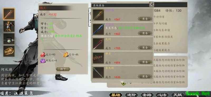 在属性选择上,优先考虑四维,技能与属性性价比相当,精通则根据实际需求决定。防具方面,偏防御可选根骨,追求输出则推荐技能增伤或身法、内力等属性。内力对伤害的提升似乎优于身法,因身法主要增加命中、闪避及轻功值。起初我佩戴两个37点身法加14点柔韧,但柔韧观感不佳,作为刚剑路线,不断重洗后得出上述经验。