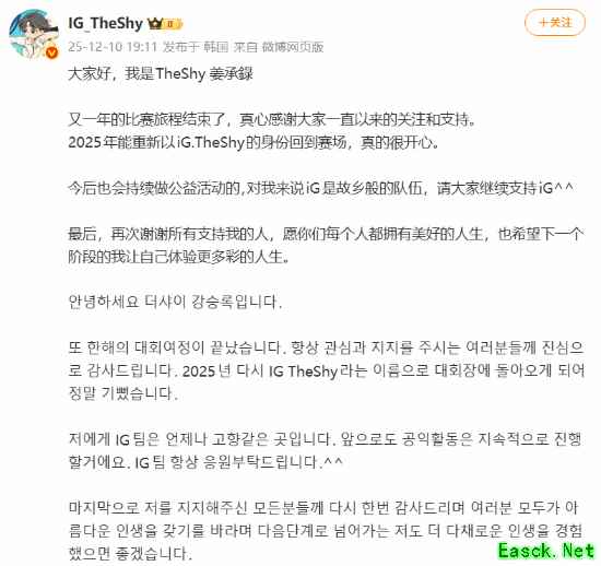 今日,《英雄联盟》iG电子竞技俱乐部官宣:上路选手姜承録(ID: TheShy)将在新赛季暂离赛场。