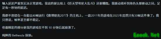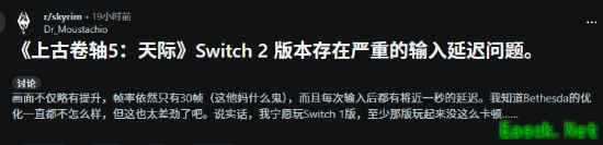 在Reddit社区,有玩家吐槽道:“一方面画面只是略微好了一点,而帧率依旧是30fps。另一方面每次输入后几乎都有接近一秒的延迟,我知道B社不擅长优化,但这次真的离谱。我宁愿回去玩Switch 1版,至少那个没这么拖沓。”不少玩家反馈了同样的问题:“输入延迟离谱,现在这个状态真的完全没法玩,无论是掌机模式还是底座模式。”