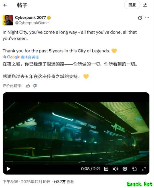 官方在推文中写道:“在夜之城里,你已经走过漫长旅途——经历的一切、见证的一切。感谢你在这座传奇之城度过的五年时光。”
