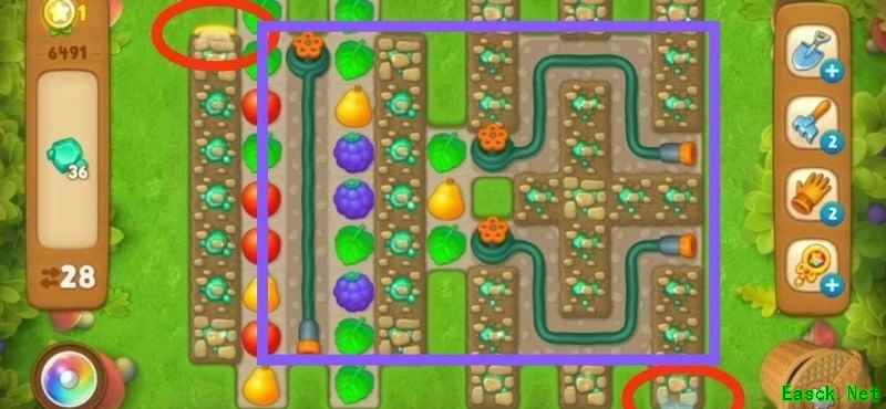 红色方框内为传送门,岩石从右下蓝门进入,从左上黄门传出;紫色区域为水管,当在旁边消除图块或使用道具时,水管会逐格卷起,直至完全收起。