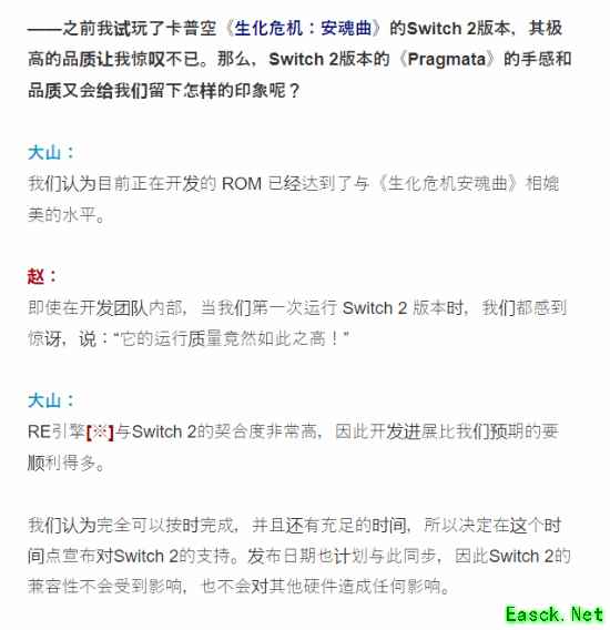 对比卡普空另一款将适配NS2的游戏《生化危机9安魂曲》,制作人表示:“就目前开发中的版本而言,我们认为其品质已达到了不逊色于《生化危机9》的水准,并对此充满信心。开发团队在第一次运行Switch 2版时也非常惊讶:居然能以这样的品质运行!”