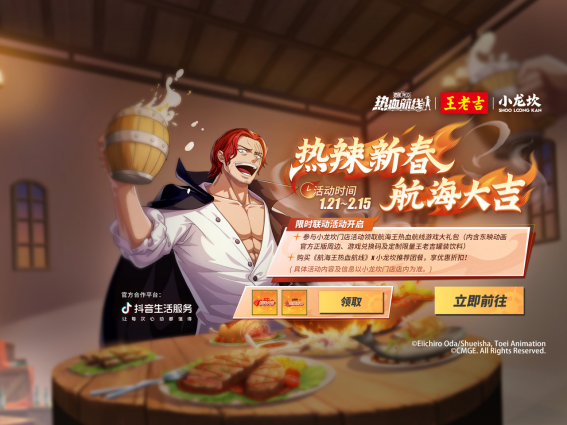1月21日-2月15日,船长们打开抖音APP进入联动主会场,还可参与抽奖活动。祝各位船长在红发的面子中收获神秘线上大礼包!