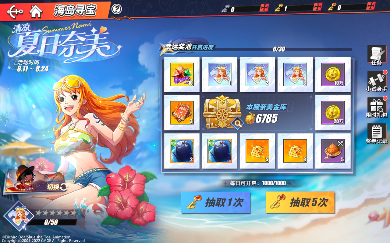 「清凉夏日·奈美」即将登陆《航海王热血航线》,她的到来,自然也为船长们准备了多重好礼。8月11日,游戏将开启【海岛寻宝】、【远航探索】等限时活动,在海域之中寻找庆典宝箱,不断探索,除收获满满的黄金之果外,届时还将有机会获得清凉夏日·奈美或者国风·艾斯伙伴碎片哦。