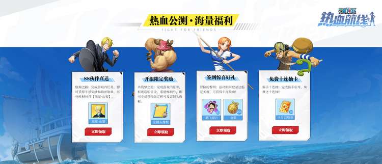 同时,公测活动也在火热进行中,玩家在游戏中完成连续登陆、新手引导等等各项任务,还能获得SS级伙伴【黑足·山智】、A级伙伴【路飞】碎片、新手十连抽、定制头像框、限定称号等的丰厚公测福利!