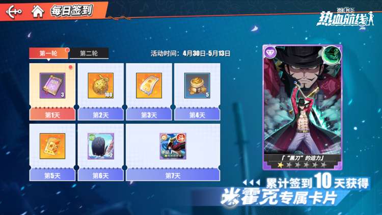 为助力广大玩家体验米霍克的力量,《航海王热血航线》手游米霍克系列主题活动同步上线——“SS伙伴·米霍克”伙伴卡池、“SS伙伴·米霍克”装备卡池、“无上剑道”主题副本、“最强剑道”主题任务、“OP知识王”活动、兑换商店均限时开启。