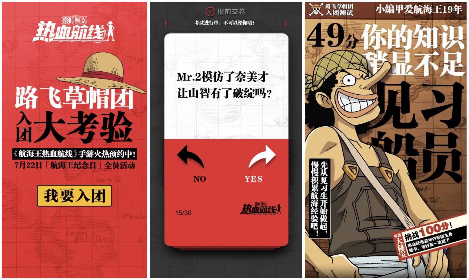全新正版3D动作手游《航海王热血航线》,也于近日发布了“草帽团入团测试“,挑战全国的硬核海米。考题不仅取材于原作动漫,更是参考了许多公式书、尾田读者专栏里的细节与设定。让众多海米惨遭滑铁卢,自嘲“假粉丝”、“剧情白看”、“就算是尾田也没法及格”,在社交媒体上“求答案”、“求攻略”。追更多年的你,要不也来挑战一下?