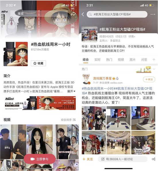 在本次活动中,《航海王热血航线》送出数十万份航海王正版周边,犒劳广大海迷之余,更诚邀多名百万人气主播带队与现场海迷同台竞技,共享航海王正版3D动作手游的魅力。本次活动获得了广大海迷的支持,目前抖音话题#热血航线周末一小时#达到8000万次播放,#北京航海王粉丝大型磕CP现场#上升至同城榜TOP12;微博话题#热血航线周末一小时#、#航海王粉丝大型磕CP现场#共6.6万讨论和1亿阅读量,话题关注度直线提升。
