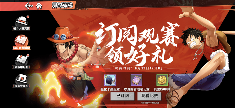 除此之外,6月8日至12日,在游戏【限时活动】页面中订阅观赛,还可收获【强化卡高级】、【珍稀的冒险笔记】、【贝里】的游戏奖励。(具体奖励以游戏【限时活动】页面的内容为准)