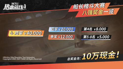 罗杰在伟大航线中埋下了令人神往的ONE PIECE宝藏,船长格斗大赛也为获胜的选手准备了丰厚的奖励!前八名选手将瓜分十万赛事奖金!