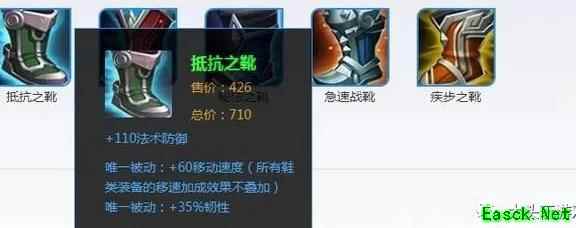 抵抗之靴提供35%韧性与110点法术防御,可减少35%被控制的持续时间,如减速、眩晕、击飞等效果。多数英雄优先选择此装备,即便前期未出,后期也可替换为该鞋以提升生存能力。
