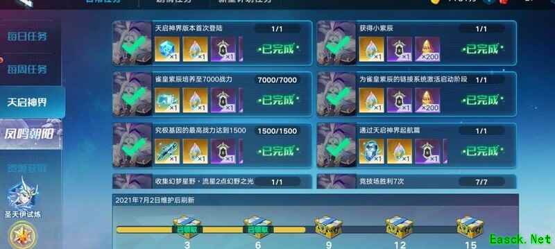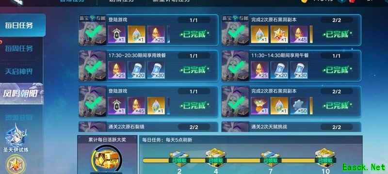 每日完成45次日常任务,可在天启神界领取一次奖励。