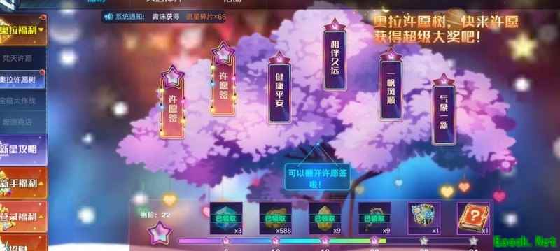 在许愿树许愿数次后可领取奖励,触发幸运事件还可能获得晶石。