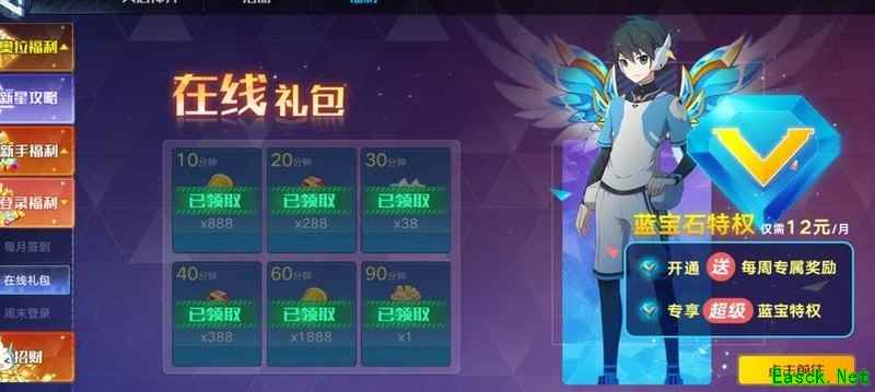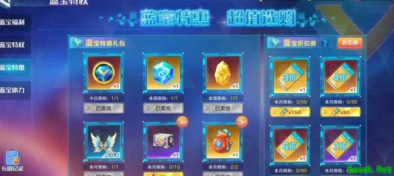 蓝宝石特区每日礼包有机会获得8888星币碎片和晶石,每周可领取一颗晶石。使用3折优惠券,仅需75星币即可购买5个晶石,每月限购两次,性价比极高。