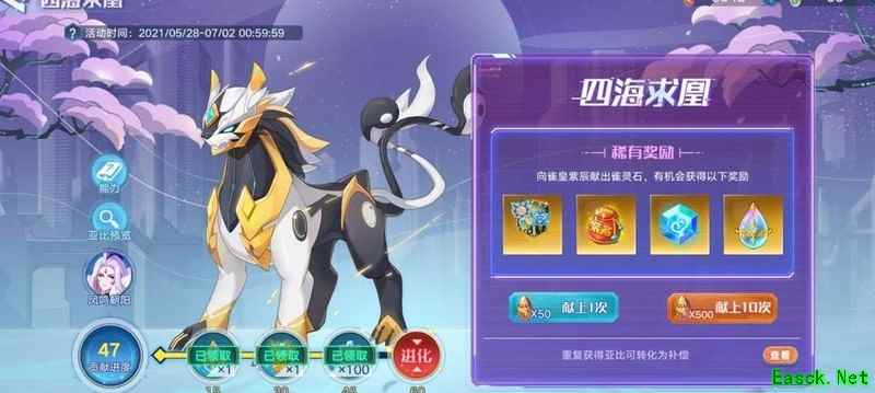 每月举办的四海求凰活动为周期性换皮玩法,参与抽奖有机会随机获得1至5枚晶石,数量完全靠运气。活动期间,雀皇旁会开启晶石商店,每店可兑换5枚,每周开放一家,具体以实际出现为准。