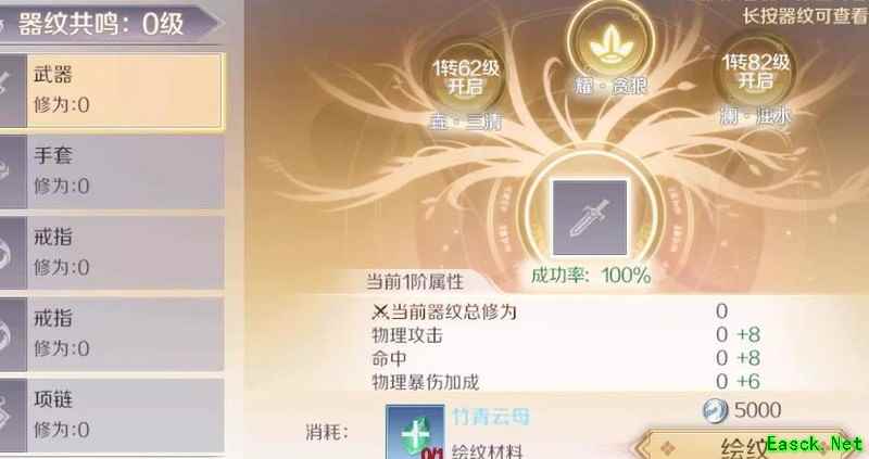 各装备器纹开启等级依次为:圭·三清(1转62级)、耀·贪狼(1转42级)、澜·浊水(1转82级),按从左至右顺序解锁。