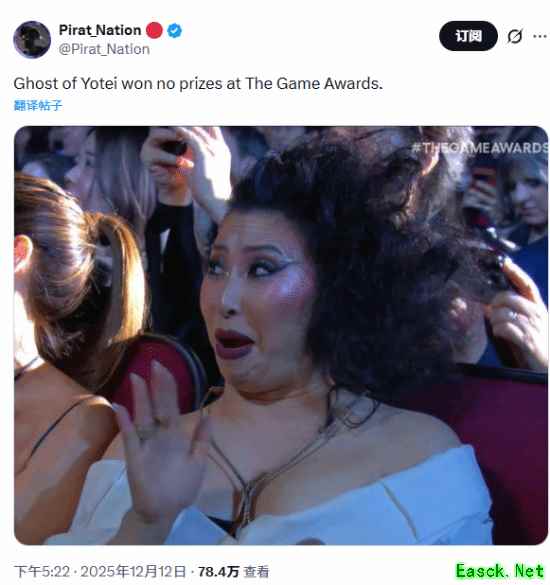 2025 年 TGA 颁奖礼后,《羊蹄山之魂》(Ghost of Yotei)未斩获任何奖项,同时,该游戏女主演员因在现场被镜头捕捉到的夸张惊讶表情(同时她也是镜头扫过时唯一在吃东西的人)引发网友热议,该贴累计获得超 78.4 万次查看。