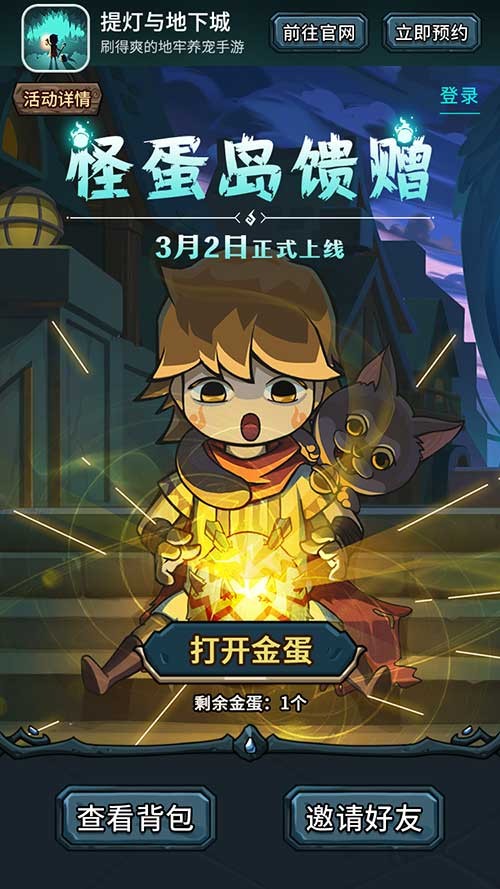 《提灯与地下城》已于TapTap开启预约解锁福利活动,预约达到对应人数即可领取相应奖励,目前,在TapTap上,安卓用户已累计预约26万人次,全网预约量已超过100万。此外,游戏还于元宵节开启了“等灯活动”,玩家在3月2日前进入指定活动页面,每日参与活动可获得2次开蛋机会,每次开蛋将随机获得一个道具,每日分享页面,可额外获得1颗好友赠送的金蛋。游戏上线后,所有已解锁的道具将自动发放到玩家绑定手机号创建的首个角色邮箱中