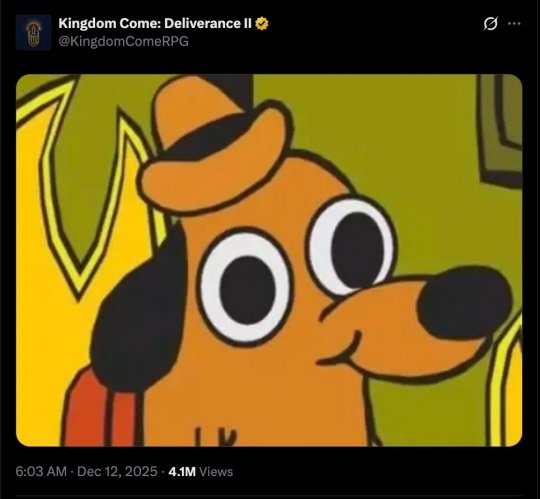 这一点从《天国:拯救2》官方Twitter/X账号的推文便可印证——该账号分享了互联网上最具标志性的梗图之一:“一切都好”(This is fine)梗中被火焰包围的狗狗。尽管推文未配任何文字,但这张梗图清晰表明,他们对《光与影:33号远征队》赢得最佳角色扮演游戏奖项感到不满。