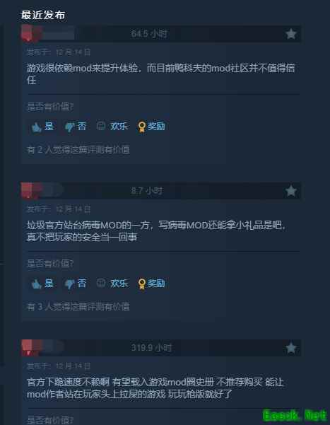 截至目前,《逃离鸭科夫》Steam激增了500多条差评,部分新评: