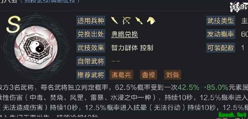 经过多次实战测试可以发现,尽管该技能单次控制触发概率为12.5%,但由于具备两种不同的控制效果,实际综合触发几率可达25%,其余情况下也多能附加持续伤害,整体表现十分亮眼。然而需注意的是,每位角色的控制效果均为独立判定,因此难以精准针对敌方某一关键单位进行限制。正因如此,更适合与高览、曹植、诸葛亮、司马懿等依赖控制或主动技能衔接的武将搭配使用。此外,该技能输出能力偏弱,并非以伤害为主,建议由辅助型武将携带,主要用于创造有利环境,协助主力输出更高效地完成压制与击杀,提升整体作战协同性。