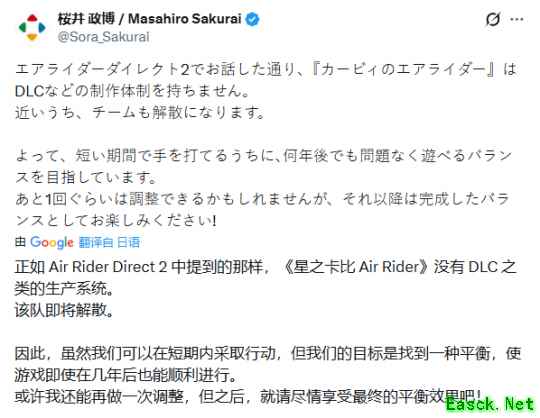 近日,知名游戏制作人樱井政博通过社交媒体宣布,其最新作品《星之卡比:飞天骑士》将不会推出任何DLC等追加内容,并且该游戏的开发团队也将在不久后解散。此消息在稍早前举行的“飞天骑士 Direct 2”活动中已有所披露。