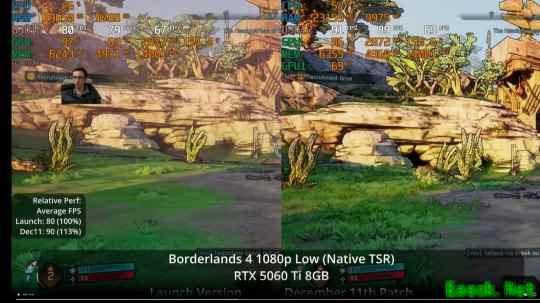 1080P,低画质,原生TSR,首发版 vs 12.11补丁后帧数对比(80 vs 90),提升13%