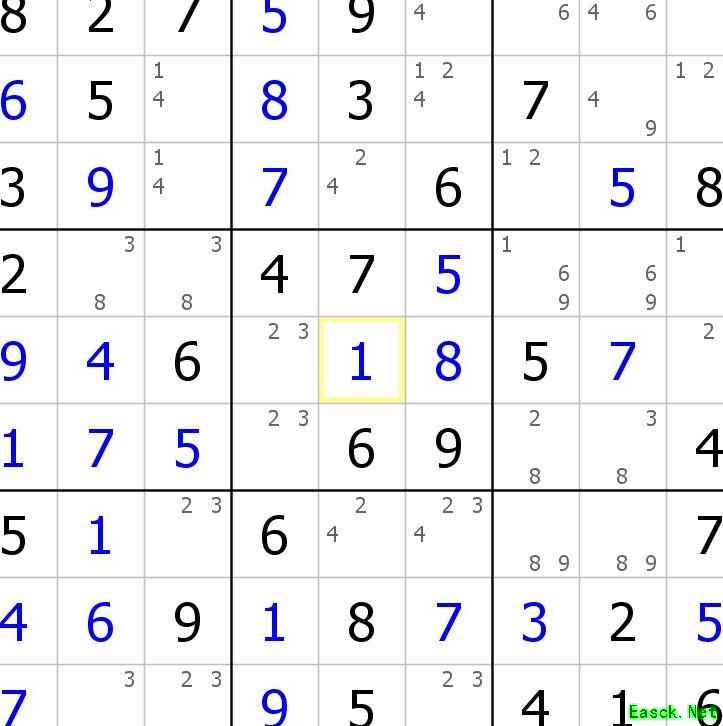 可将图中R1C3的57视为XY格,其中XZ为27,YZ为25,Z代表数字2。由于R2C1与R1C6共同影响某一格,该格中的候选数2可被排除,即图中红底所示的2。